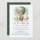 Captivando o convite do chá de fraldas "Deixe a Aventura Começar" com uma adorável raposa segurando um ursinho de pelúcia cavalgando em um balão de ar quente verde. O céu verde com aquarela tem nuvens brancas com estrelas douradas circundantes. Padrão de estrelas brancas sobre fundo verde escuro no fundo do convite. Modelos fornecidos.