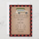 Casamento temático "A Aventura Começa" para o casal ao ar livre que inclui suv descascado de madeira decorado com verde floral e latas de estanho com canoa no topo. O estoque de papelão inspirou fundo com borda de xadrez de búfalo vermelha e preta, e inverso.