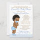 Dirigir por chá de fraldas com adorável menino afro-americano com cabelo afro giro vestindo máscara e roupa azul em um fundo azul pastel e ouro. Esse garoto giro por chá de fraldas é facilmente personalizado para seu evento simplesmente mudando o texto. Você pode alterar a cor do texto, escolher o estilo da fonte, o texto, etc.