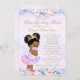 A princesa dirige por chá de fraldas convidada com uma adorável princesa afro-americana com cabelo afro giro vestindo uma máscara, roupas cor-de-rosa e roxo e coroa num bonito fundo floral rosa e roxo. Essa garota bonita dirige por chá de fraldas é facilmente personalizada para seu evento simplesmente mudando o texto. Você pode alterar a cor do texto, escolher o estilo da fonte, o texto, etc.