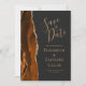 Este elegante e moderno salve a placa de data apresenta uma cor d'água laranja queimada e borda geode aparada com falso brilho dourado. O texto dourado aparece sobre um fundo preto-e-escuro. Substitua facilmente a imagem de amostra no lado oposto por uma foto vertical da futura noiva e noiva.