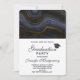 Um convite para a graduação com um boné de formatura preto e uma bela imagem de pedra abstrato de agate escura. As cores giram em ondas. As cores principais são cinzas pretas, azuis, com uma fita falsa-dourada que passa pela design. Moderno e moderno.