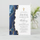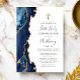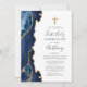 A borda esquerda deste elegante e moderno convite para a primeira comunhão apresenta uma marinho azul de aquarela agata borda aparada com falso brilho dourado. Uma cruz falsa de folha de ouro aparece acima do texto personalizável, que combina escrita manual, copperplate e fontes itálicas em cinzas de carvão em um fundo branco. O verso apresenta um design azul-marinho e um agate-ouro correspondentes.