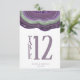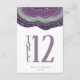Nem todos os designs de casamento são criados iguais. Os layouts assimétricos para as peças neste impressionante conjunto de casamento provam que isso não é ruim! Bandas de cor onduladas em tons contrastantes de roxo violeta e verde com um centro de cristal brilhando formam um sotaque geode/agate na maioria das peças do conjunto. O cartão 'Número da Tabela' do casamento mostrado aqui apresenta o acima mais uma modelo para adicionar seus nomes e data do casamento. Procure ID647 para ver todas as peças de coordenação neste conjunto.