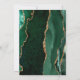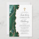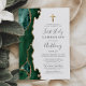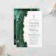 A borda esquerda deste elegante convite de primeira comunhão moderno apresenta uma esmeralda verde aquarela agate borda aparada com falsa brilho dourado. Uma cruz falsa de folha de ouro aparece acima do texto personalizável, que combina escrita manual, copperplate e fontes itálicas em cinzas de carvão em um fundo branco. O verso apresenta um design emerald verde e dourado.