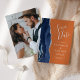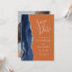 Este elegante e moderno salve a placa de data apresenta uma cor d'água azul marinho, borda agitada com falso brilho prateado. O texto personalizável é cinza prateada leve em um fundo laranja queimado. Substitua facilmente a imagem de amostra no lado oposto por uma foto vertical da futura noiva e noiva.