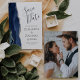Este elegante e moderno salve a placa de data apresenta uma cor d'água azul marinho, borda agitada com falso brilho prateado. O texto personalizável é uma cinza de carvão em um fundo branco. Substitua facilmente a imagem de amostra no lado oposto por uma foto vertical da futura noiva e noiva.