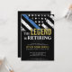 Este design apresenta uma bandeira da polícia com listras pretas e brancas, e uma fina faixa azul de linha também. O texto "A lenda está se aposentando" se senta acima de todos os detalhes partidários para os detalhes do polícia aposentado, xerife, capitão ou chefe do partido aposentado.