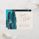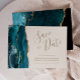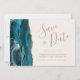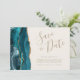 Este elegante e moderno salve o cartão de data apresenta uma cor azul lacrimejante agata borda cortada com falso brilho dourado. O texto personalizável combina um script de escrita manuscrita dourada, fontes copperplate e itálico em um fundo de marfim. O verso apresenta um design de cor azul-lacrimejante e um agate dourado.