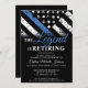 Este design apresenta uma bandeira da polícia com listras pretas e brancas, e uma fina faixa azul de linha também. O texto "A lenda está se aposentando" se senta acima de todos os detalhes do partido para os detalhes do polícia aposentado, xerife, capitão ou chefe do partido aposentado.