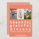 Os cartões com fotos da família de Ação de Graças de Bolinhas Branca Simples e giro, Graciosos e Gratos Laranja, são a forma perfeita de enviar amor e gratidão a todos os seus amigos e família nesta Ação de Graças. Apresenta uma bolinhas cor de laranja e branca de volta, três locais para fotografias de toda a família, tipografia branca "Graças a Deus, graças a Deus, que vos abençoe por terem nas nossas vidas" e texto branco "Os Andersons" que pode ser alterado para o nome da vossa família.