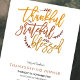 Palavras inspiradoras Graças, Grateful, abençoado em um roteiro elegante em cores internas estão na metade superior, e os detalhes estão abaixo em um fundo branco. Personalize facilmente o texto com seus detalhes.