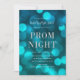 Convite de baile elegante com as palavras "Prom Night" em folha de prata falsa contra um fundo de luzes bokeh azul aqua. O convite tem um verso com fundo azul escuro.