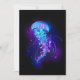 Água-viva grande, azul, desenhada artisticamente, brilhante, brilhante, com longos tentáculos sobre fundo preto com bioluminescência roxa. Água-viva luminosa.