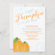 Aguarela poucos convites do chá de fraldas do menino da abóbora. Um design temático da queda que caracteriza duas abóboras alaranjadas, redemoinhos e uma pia batismal moderna do roteiro no azul e na laranja do outono.
