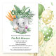 Um convite para o chá de fraldas de elefantes da selva tropical. Este convite apresenta um lindo elefante bebê cinza sentado no seu trono da selva tropical. Adequado para Mães esperando um bebê.