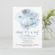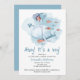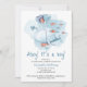 Ahoy! É um menino! Um convite de chá de fraldas bonito que inclui uma ilustração de baleia e cores azul e branca. Personalize-o para celebrar a futura mãe, adicionando os detalhes da sua festa, o rsvp e as informações do registro.