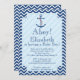 Comece seu chá de fraldas de férias de verão com nossa tia. É um convite para chás de fraldas de âncora de menino. Nosso convite para chá de fraldas de barco à vela na moda e moderno do oceano apresenta uma âncora azul moderna em um fundo azul com uma borda azul e branca em ziguezague. Para um toque especial extra na parte de trás do convite há um padrão de cóvron azul correspondente. ©Blackleaf Designs