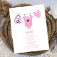 Tema do chá de fraldas náutico com ilustração de um fato marinheiro cor-de-rosa, fralda de pano e uma bib listrada com âncora azul marinho e caimento pendurado na linha de clothesline.