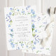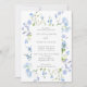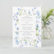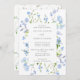 Um bonito convite de casamento com um quadro retangular rodeado por flores azuis-claras e verde-claro. Perfeito para um casamento de primavera ou verão.