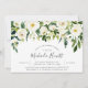 O chá de panela floral chico apresenta uma borda superior de rosas de marfim e peônias brancas com folhagem botânica e verde-limpas. Personalize com os detalhes do seu chá de panela no moderno roteiro escrito à mão e no sans serif lettering. Convites invertendo para joias ricas em verde-jasper.