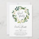 Os convites para festas de formatura florais elegantes apresentam uma coroa de rosas brancas de aquarelas e peônias com folhas e folhagem botânica verde-luxuosa, cercando a "festa de formando" em letra manuscrita chica. Personalize com seus detalhes de celebração da graduação abaixo.