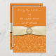 Convites alaranjados do casamento da fita do redemoinho e do marfim---combine os cartões de RSVP encontrados na parte inferior desta página. Cada convite caracteriza um elegante, o falso textured, o design swirly alaranjado na metade inferior com uma fita impressa e os diamantes do falso como um divisor. Obtenha o olhar de convites luxuosos sem quebrar o banco ou tornar-se sujeito aos custos do porte postal adicional. A carga de serviços postais muito mais no porte postal para o algum "colide" que os enfeites reais criarem no empacotamento do envelope. Estes convites do casamento são ajustados ao estoque básico de alta qualidade do cartão; contudo, você pode mudar o estoque ao linho, feltro (gravado), reciclado, e diversas máscaras metálicas se você gostaria sob o número 2 (escolhem seus estilo, tamanho & tipo de papel) abaixo da laranja adicionam ao botão do carro. Uma lista dos custos adicionais para um estoque mais extravagante do cartão é indicada igualmente sob essa opção. Cada convite vem com um envelope branco cabido.