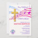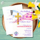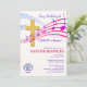Convite moderno de PÁSCOA ALELUIA CRISTO RESSSUSCITOU, mostrando uma cruz vazia dourada entre pautas musicais coloridas. O texto da Páscoa aparece em cor lilás. Estas palavras serão cantadas por cristãos em todo o mundo para celebrar a ressurreição do nosso Senhor Jesus Cristo no Calvário. Este convite moderno de Páscoa cristã seria um ótimo convite para os serviços da Páscoa para enviar a familiares, amigos, vizinhos e clientes para celebrar o Domingo da Ressurreição na sua igreja. ADICIONE O LOGÓTIPO DA SUA IGREJA E CÓDIGO QR E PERSONALIZE O SEU CONVITE. Escolha entre uma ampla seleção de designs de Páscoa baseados na fé cristã em cartões, convites, decoração para casa, roupas e presentes, criados pela Berean Designs. Presentes e decoração para igreja/lar