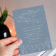Este Chá de panela Floral Minimalista "Algo Azul Antes que Eu Faça" é um design Floral é uma personificação espantosa de elegância refinada e beleza minimalista. Exude uma sensação de sofisticação subestimada, fazer-a uma escolha verdadeiramente cativante para o seu chá de panela. A paleta de cores deste design apresenta uma tonalidade azul empoeirada, que adiciona um toque de serenidade e tranquilidade. Este tom suave e mudo cria um senso de calma, ao mesmo tempo que proporciona uma reviravolta moderna sobre o tema tradicional "algo azul". A incorporação de elementos florais de arte em tons de branco complementares adiciona um toque de romance e feminilidade. A tipografia escolhida para essa design de convite é elegante e refinada, com caligrafia que expele um apelo ao eterno. Os traços delicados e graciosos da inscrição reforçam a sensação geral de sofisticação, ao mesmo tempo que garantem que os detalhes importantes do chá de panela são belamente apresentados. O arranjo ponderado do texto cria um equilíbrio harmonioso entre elegância e clareza, permitindo que a informação seja facilmente lida e compreendida. Itens correspondentes estão disponíveis. Consulte a coleção de cheios aqui: https://www.zazzle.com/collections/dusty_blue_classic_minimalist_collection-119092113454390993