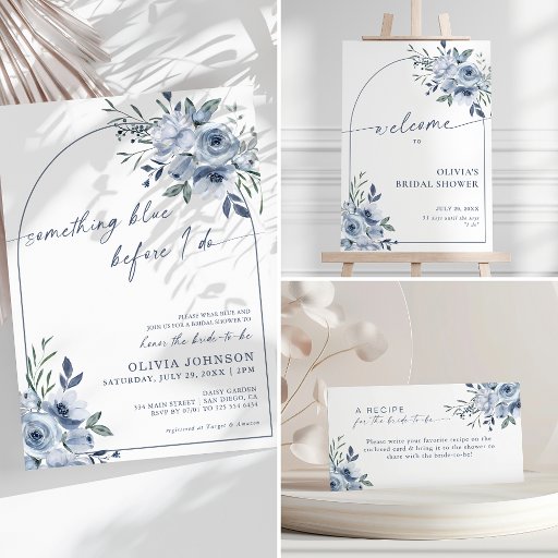 Chá de panela azul empoeirado de arco elegante "algo azul antes de eu fazer" com design de folhagem azul de cor d'água.