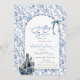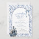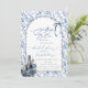 Este convite elegante apresenta um charmoso arco azul, uma garrafa de vinho e rosas azuis perfeitos para um chá de panela "algo azul". Esses convites de chá de panela são facilmente personalizados para o seu evento simplesmente adicionando seus detalhes. Os intrincados motivos florais e matizes azuis macios sussurram de algo antigo, algo novo, e claro, algo azul.