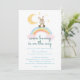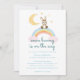 Este design de convite faz parte da coleção de chá de bebê "Algum Coelhino Está a Caminho", que apresenta designs fofos com coelhos em aquarela, flores de Páscoa, arco-íris e nuvens em tons neutros (marrom, laranja, bege, amarelo e rosa claro).