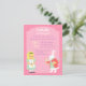 Convide seus convidados para uma festa de chá de aniversário em Wonderland com esta bela Alice no convite de festas temático Wonderland! Alice em uma banda de cabelo, vestido azul e pináver branco que está segurando em uma garrafa com uma etiqueta "Beba-me". o coelho branco em uma camisa azul e jaqueta vermelha, um guarda-chuva embaixo do braço e olhando para a hora do relógio de bolso. Fundo rosa com pontos dispostos em quadrados diagonais. Colorida e adorável, este convite é excelente para aniversários que amam a história Alice no País das Maravilhas!