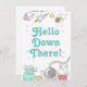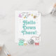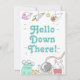 "Olá Lá embaixo" escrito em letras brilhantes e coloridas com criaturas espaciais engraçadas dizendo olá para nós, terráqueos. Há espaço no verso para sua mensagem pessoal (ou você pode excluir o texto completo, se preferir).
