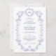 Elegant classic traditional floral French Victorian dusty blue toile de jouy chinoiserie style crest monogrammed charming budget affordable all in one wedding invitation with all the details, QR code to RSVP on website.