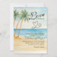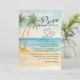 Um convite elegante para casamentos com praia de aquarela e palmeiras que você pode personalizar com seus detalhes.