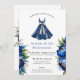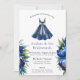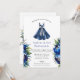 Um belamente ilustrado buquê de flores. As flores estão predominantemente em tons de azul real, branco e bege, com detalhes intrincados destacando suas pétalas, estames e folhas. O buquê é posicionado centralmente e as flores parecem ser dispostas em cascata, com algumas folhas e flores menores espiando-se pelas laterais. A paleta de cores é macia e calmante, com fundo branco que contrasta fortemente com as flores vibrantes.
