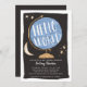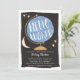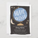 Modelo de convite para viagem de aventura vítrea e capricho ou tema com de convite para chás de fraldas com um globo azul com um dentro de texto tipográfico com letra de mão que diz "Olá Mundo" com uma lua e estrelas à sua volta. Excelente para o chá de um menino.