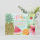 Convite de aniversário tropical, de Verão, com uma saudação colorida de "Aloha", fruta de aquarela (abacaxi, melancia, laranja), um cocktail gelado com guarda-chuva de bebida festiva, uma flor de hibisco rosa e uma folha de palma em fundo azul-aqua pintado à mão. O verso é um padrão de abacaxi fofo em um fundo de gradiente de aquarela. Personalize-o com seu nome, idade e detalhes da festa. *Se você está procurando convites para a festa de aniversário de uma criança, este mesmo coquetel de design também está disponível na minha loja.
