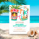 O convite de aniversário para o tema do luau tropical apresenta uma máscara tiki pintada manualmente, abacaxi, surfboard e papagaio com a tipografia "Hora de Tiki". Sexo neutro e funciona para qualquer idade. Perfeito para temas de ilha, praia e verão. Trabalho de arte por ações da KL
