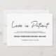 Devido à situação atual, é compreensível que algum casamento tenha de ser suspenso. Usando as palavras "Amor é Paciente" para uma maneira positiva de entregar a mensagem do adiamento do seu casamento, personalize este cartão "Mudança de planos" para manter seus convidados e sua família informados. Tpografia simples, em preto e branco, estilo moderno.