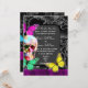 Bonito estilo gótico de fantasia alternativo açúcar crânio floral convite de casamento tradicional formal, no escuro negro barroco úmido, fundo profissional em volta do estilo do quadro de cinza, convidando, com borboletas coloridas, personalizar facilmente a noiva e os nomes dos noivos para os modelos para criar um convite personalizado único para o seu gótico romântico especial ou alternativo ocasiões e celebrações temáticas do na moda. Visite a LOJA PERSONALIZED_WEDDINGS para combinar conjuntos coordenados de suítes de casamento. Pode ser facilmente personalizado para outras ocasiões e celebrações especiais de góticos de alternativo.