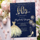 Confete de ouro elegante, saltos altos, vestidos e balões em um fundo azul marinho.
