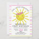 Convite de aniversário de sol bonito para comemorar o seu primeiro aniversário de sol. Você tem um belo sol amarelo com ilustração de flores rosa para refletir seu tema de aniversário de sol. O padrão de listras cor-de-rosa e amarelas no verso adiciona um olhar moderno ao convite da festa de sol. personalize com detalhes. Entre em contato para obter ajuda.
