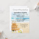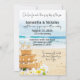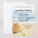 Seu amor é tão profundo quanto o mar, e este belo convite de casamento mostra. Um bolo de casamento feito de areia, cercado por flores para casamentos, e tocado com estrelas-do-mar na praia perto do oceano neste design de convite único para a praia. Escolha perfeita para um casamento de destino.