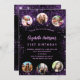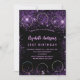 Um convite de aniversário feminino e feminino de 21 ruas (ou qualquer idade). Na frente: Um fundo preto chic. Decorado com pó brilhante púrpura escura. Personalize e adicione um nome, detalhes da festa e 6 fotos. O nome é escrito com um script de estilo manuscrito, letras claras e roxas. Fundo: fundo preto e brilho sujo.