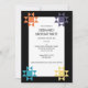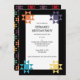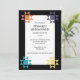 Estes convites de festas personalizados têm um tema de colcha com blocos de colcha Ohio Star acentuando a frente do convite, e um padrão de colcha no lado oposto, fazer-os perfeitos para jogar festas de aniversário ou festas de aposentadoria para colchetes. Todo o texto está pronto para seu toque personalizado para que você possa criar o convite perfeito para seu evento especial. Blocos de coloração clara são colocados sobre um fundo preto.