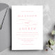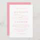 Convite de casamento simples, clássico, cor-de-rosa-rosa e branco com "e" em uma letra elegante que é perfeita para casamentos em qualquer época do ano. O reverso do convite de casamento apresenta um design de padrão vinculado tradicional. Personalize os convites de casamento de na moda com seus detalhes de casamento personalizados!