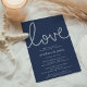 Nossos elegantes convites para janto de ensaio de verão apresentam estilo náutico clássico em azul e branco marinho. "Amor" aparece no topo em letras brancas escritas formadas com corda náutica. Personalize com seu ensaio de cerimônia e jante detalhes abaixo em uma combinação chic de serif e sans serif lettering. Perfeito para jantadas náuticas, técnicas de praia ou de ensaio de verão. Convites invertendo a um padrão de corda em marinho em branco.