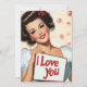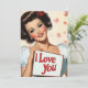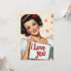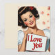 Uma ilustração vibrante no estilo pino-up clássico dos anos 1950. A imagem apresenta uma mulher glamourosa com curvas vintages, maquiagem ousada e um sorriso radiante. Ela segura uma placa com uma mensagem amorosa, "Eu te amo", colocada contra um pano de fundo de delicadas rosas rosa. A estética geral captura a vibração romântica e brincalhona da arte "pin-up" do século do médio.